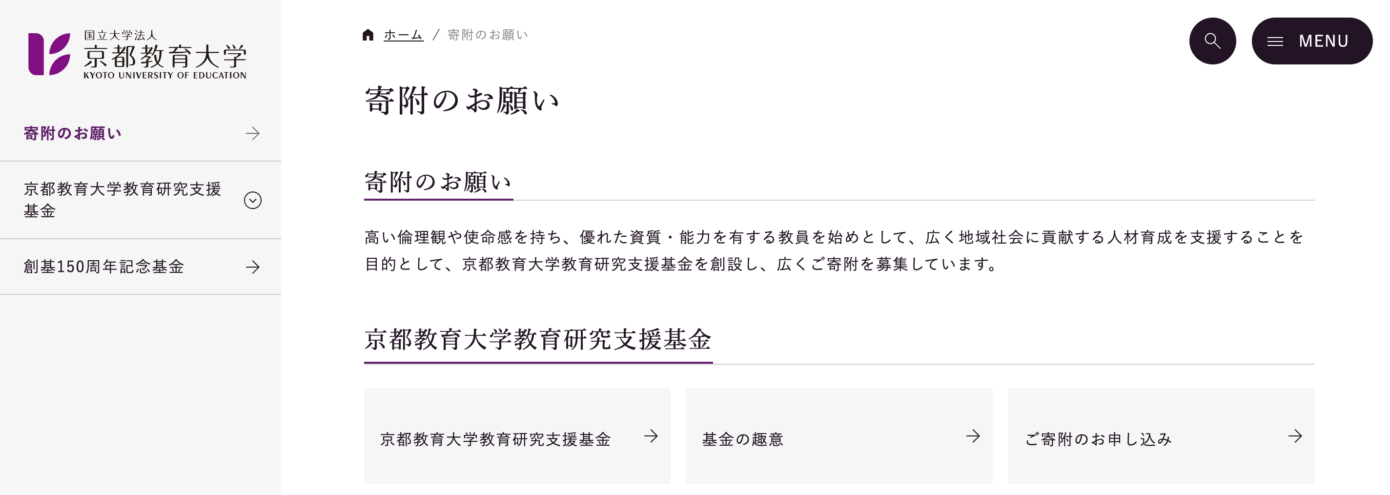 | 問合せ先: | 京都教育大学 総務・企画課 企画・広報グループ 075-644-8186 donation@kyokyo-u.ac.jp |